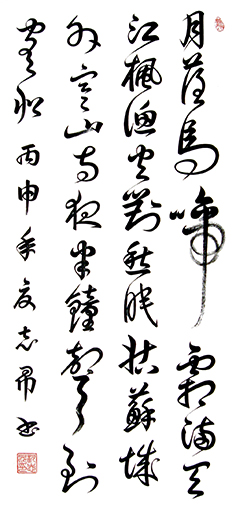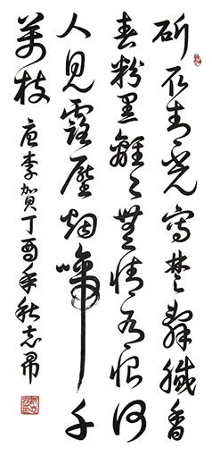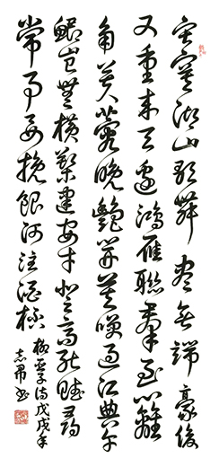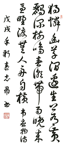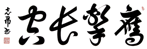 他并没有骄傲,他认为书法的最高境界是写心、写思想、写感情。沈志昂先生的书法已达到了这一境界。他把传统的书法技巧有机地同现代书法相结合,用抽象的奇妙书法技巧大胆地创新,其丰富的墨色变化妙不可言,字一笔书就,一气呵成,俨然蛟龙戏水,巨龙游天,把写意画的用笔手法溶入字中,字中有画,画为字用,行笔错落起伏,气度非凡,使观者叫绝。写出了他对笔墨人生的感悟。