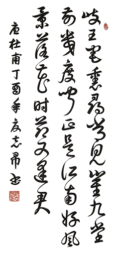 他的书法肥而有骨,骨肉相济,活泼而灵动。那用笔的多变,章法的烂熟,上下的映带,左右的顾盼,错落起伏,跃然纸上。在那流动的线条中,方圆、疏密、大小、长短、粗细、浓、淡、枯、湿多变灵活。大气磅礴如行云流水,真可谓标新立异、匠心独具,已有了自己独特的笔法和别具一格的艺术表现形式。