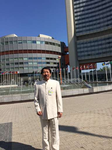 2015年受联合国工业发展组织邀请,赴奥地利参加中文日活动,在维也纳联合国城会议大厅做《中国文字的演变和书法传承》演讲。表演“歌墨舞”狂草壁书并举办个人书法展,部分作品被联合国收藏。