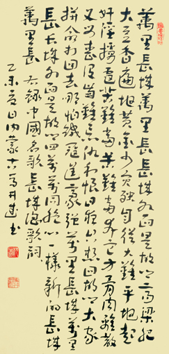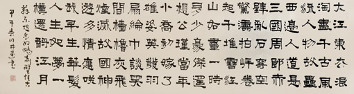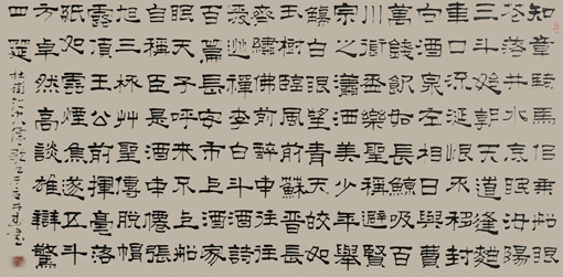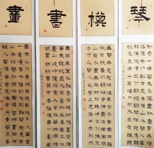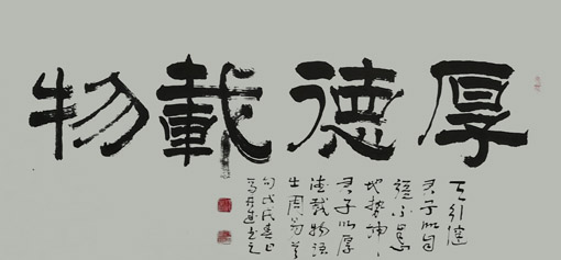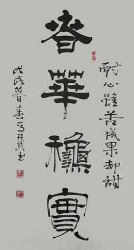 学书以隶为根,延伸章草,行草亦多有用功。创作中追求张迁碑的方劲沉着,章草的简约含蓄,平正中有韵致,苍劲中显奇巧,力求在墨迹中透出清雅超脱之气,给人以平正沉着、娴静恬适之感,以表达自己正气浩然,甘于谈泊、远离喧嚣的生活态度。