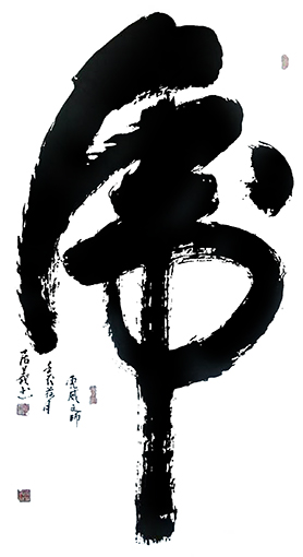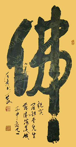 他的创作是循序渐进的心理流程体验,凭借他对传统的深厚功力与感悟,一点一滴地融化在传统的体验过程中。由此可知,尚居义先生的独字榜书不琢磨、不雕饰,如璞玉浑金,显示出大气磅礴之风格。这种淳朴、和谐、敦厚之美,有着丰富的艺术内涵,当然也有着不寻常的高难度,古人曰:榜书“自古为难”“盖榜书至难”;“惟榜书极难”。其难在技术上要充分注意到与小字的区别。在路径上要以榜书自身规律的把握为准进行专门研习与积累。这种重诚实、不伪作的从艺态度决定了他的大将之风,是媚俗邀赏者所难以企及的。 书艺因人格而鲜活,人格因书艺而彰显。由于尚居义先生对独字榜书书法艺术的不断追求,自觉用笔墨为时代服务,多次在国内外大赛获奖,倍受藏家和书画爱好者收藏与喜爱。