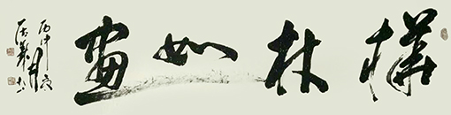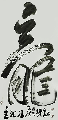 从书法作品中体现了他的笔墨雍容、安静简穆、雄深雅健的独字榜书艺术风格。厚重与豪放,凝炼了他深厚的文化功底、高尚的思想情操、宽阔博大的胸襟。他更注重书作中的整体气象,从气格、气度、气韵等角度来综合审视和提升作品的品位。