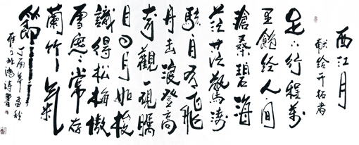 其多年创作思想性、艺术性统一的艺术作品,诗词书法代表作《玉带桥记》创作于1991年。创作了《中国魂》《书法论道》《搏爱》《梦的联想》等诗词书法近几百首。几渡玉带不觉多,满目清新点碧螺,世人只赏端雅丽,何识洁身配朝罗。其见景抒情,赞颂历史文化的端庄,秀丽,高雅。其认为为朝执政,兼洁为品,是龙颜道脉之根谛。《观紫京城记》:巍峨壮覌紫京城,千龙喷水三和宫,阅尽王朝谁立传,唯见艺海今览胜。从人的有限生命,创无限生命的价值观,阐释了职位,金钱都不是自己的,只有劳动人民的智慧,艺术的高雅,可以造福人民,流芳百世。《西江月》献给开拓者:“足下行程万里,饱经人间沧桑,碧海茫茫惊涛骇,自有飞舟击浪,登高奇覌一现,瞩目日月如梭,识得松梅傲雪寒,常存兰竹气节。”这首作品创作于2002年,肯定了创业者的傲骨精神,描绘了他们创业的艰难岁月,更点出面对成功永保兰竹气节,守业的重要性。《西江月》盛世中华:“中国开盛世,六十史程,旗跃长空礼炮鸣,三军威严铸长城,金秋浩荡,征途多坎坷,修文偃武,华夏儿女尽仁杰,正气浩然创新宇,江山永固。”创作于2009年,适逢国庆六十年,这首作品赞扬了新中国的伟大功绩,期待中华民族文武并举,正气浩然,开创新中国空前盛世,永保常春,不断进取,再创辉煌。
