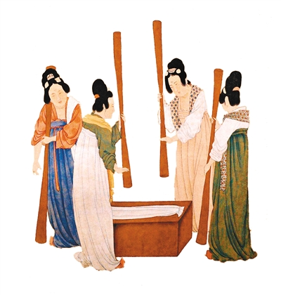在唐代开放思维的影响下,妇女成为了那个时代最亮丽的一道风景,在千古流传的画作中,就有一幅清晰地记录了唐代妇女协同劳动时的风采。这幅由唐代画家张萱创作的《捣练图》是一幅工笔重设色画,纵37厘米,横145.3厘米。“练”是一种丝织品,刚刚织成时质地坚硬,必须经过沸煮、漂白,再用杵捣,才能变得柔软洁白。《捣练图》长卷共刻画了十二个人物形象,按劳动工序分成捣练、织线、熨烫三组场面。第一组描绘四个人以木杵捣练的情景;第二组画两人,一人坐在地毡上理线,一人坐于凳上缝纫,组成了织线的情景;第三组是几人熨烫的场景,还有一个女孩淘气地从布底下窜来窜去。画中人物动作自然,细节刻画生动,妇女扯绢时用力地微微后退后仰,表现出作者观察得细致入微。此画作线条工细遒劲,设色富丽,“丰肥体”的人物造型,表现出唐代仕女画的典型风格。