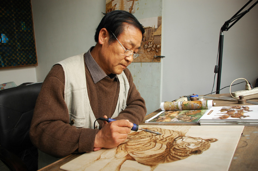 经多年烙画研究,并有所创新。在不断摸索中,针对传统烙画的单色、褪色、黑暗、以线描为主、等缺陷,进行潜心研究,将典雅传统烙画负于新的内涵和突破,把古老烙画艺术推向新的时代。研究成就表现在:一,改面换脸,由黑,黄,暗画面,变为色彩亮丽色泽丰富,不失古朴自然。具有妙的视觉。二,将木质材料改性处理,充分利用木材汗眼结构,吸附渗透功能,色彩利用上有新突破,矿质,中草,现代颜料加入媒介综合利用,三,画面处理有新方法,随着色彩深入表里,先氧化后固化再蜡封,水分子不能侵入,不怕生活光照射,画面稳定不褪变,提高了长期保存永久收藏价值。四,烙画到目前效果,已不是单一烙画艺术,而包含了木具制作,色彩学,美术学,化学,烙铁改造利用物理几何知识等,而是金木水火土尽藏其中综合艺术。