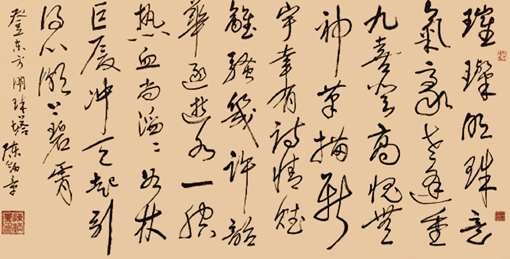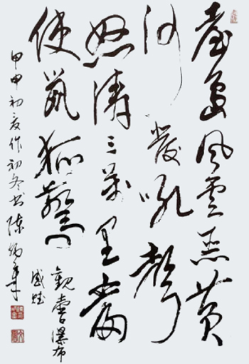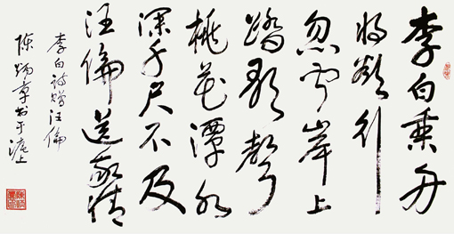 陈炳章作品《赠汪伦》李白乘舟将欲行,忽闻岸上踏歌声。桃花潭水深千尺,不及汪伦送我情。