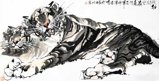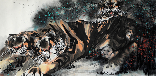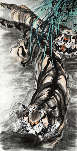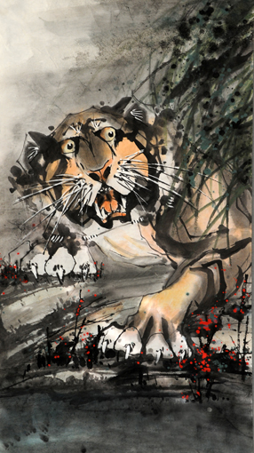 虎,不易画,因为这一题材可直接借鉴的画法和范本不多,真虎难见,偶然相遇,已是魂飞胆丧,再加之历史上人们对虎怀有既敬又畏的矛盾心理,在没有最终降伏它之前,人们还没有像现在这样把虎作为审美对象加以欣赏,这也影响到了对虎画的需求。这诸多因素,导致历史上少有画虎名家出现,也就少有优秀作品传世。直到近代人们与老虎的距离越来越近,往往会发现老虎不同的美,陈忠老师就是发现了这种独特的美,又给人们刷新了对老虎的认识。陈的虎既有传统绘画的笔墨之道又有新创新的融合,所以,陈忠老师在画虎上有着自己独有的风格。