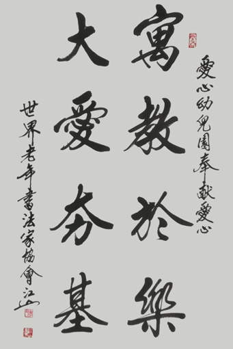 2013年九九重阳节,江山先生将99幅价值200余万元的“尊老、敬老、爱老”的主题楹联书法珍品一次性无偿捐赠给了世界老年健康事业联合会。