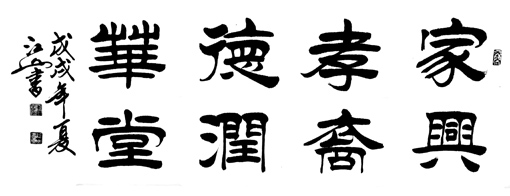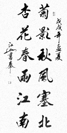 江山先生自幼酷爱文学书法,曾拜全国著名书法家王梦赓先生为师,扎实研练,默默耕耘。2005年以来尤其以书写冠名联见长,曾为包括国家领导人在内的社会各界人士书写冠名联七千余幅。江山书法秀美飘逸,雅俗共赏,多次参加全国书法大赛并屡获大奖。其中《沁园春·雪》,苏东坡词《念奴娇·赤壁怀古》等大幅行书作品,曾作为国礼赠送给韩国日本贵宾。部分作品已被欧阳询纪念馆,苏东坡纪念馆,李可染故居,中国盛世收藏拍卖公司,中国航空公司,中国集邮总公司等多家单位收藏。