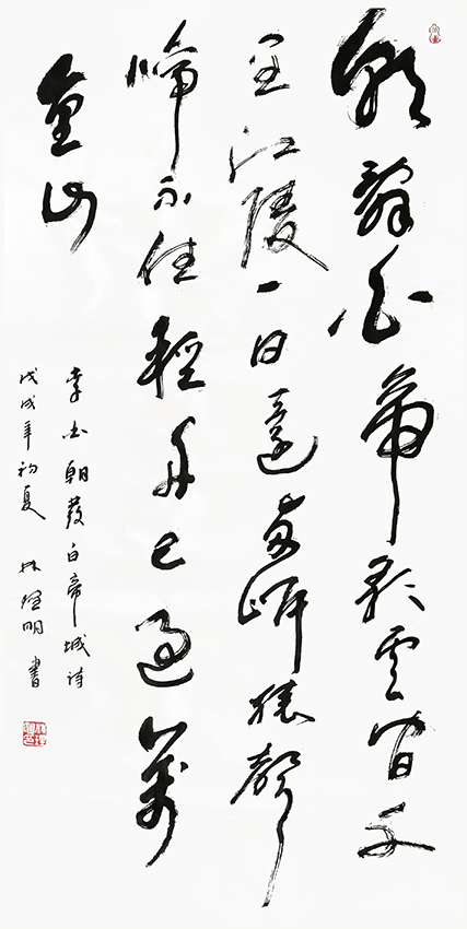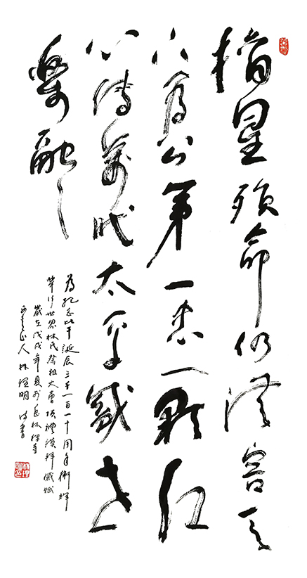 林理明先生坚持艺术的价值还原他的人生历程。他除了借助笔墨书法,还开辟了属于自我的一片诗词创作天地。“金鸡报晓曙光明,一唱雄鸡天下平。心有灵犀重明鸟,鸡身五德共和声。”此片佳作便是出自林理明先生之手,从严苛的格律讲究中可以看出先生创作功底之深厚,大气的用词手法看出其心胸之阔达。他曾用诗词赞美祖国大好河山。表达对人民生活的关情、对未来抱负的展望,创作出诸多幅佳品,出版《闲心诗词集》,同时被授予“和谐诗人”称号。品读先生笔下的诗词作品,感受那一份源自内心的诗情画意。