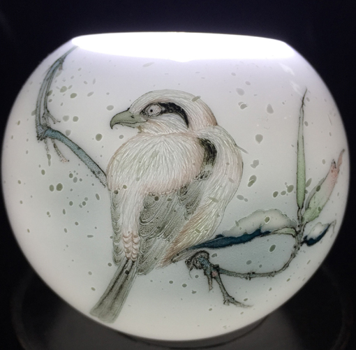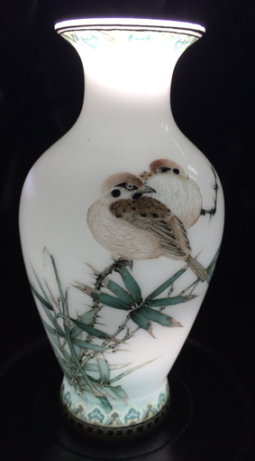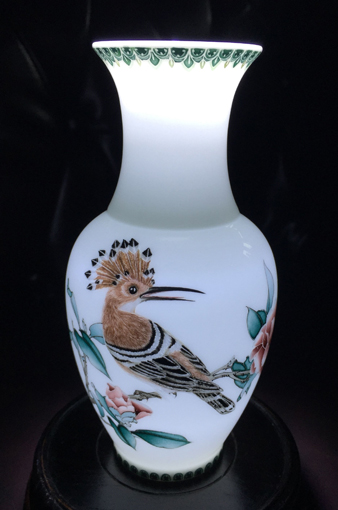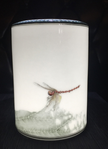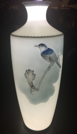 观陶润文的釉下五彩人物走禽更是一种视觉享受。他笔下人物,色泽粉润柔和,细腻丰富。传情达意,不止乎于形。画面中藤蔓曲折环绕,脉络细节纤毫毕现,而巧妙的穿插安排却使画面呼吸畅通、节奏明朗不拥挤拖沓,气度浑然而细节处见娟秀。近景双钩,细致入微,细节处一丝不苟,富有感染力。造型生动,物象相互呼应,富有动感却不失井然之序,色泽淡雅明快。构图老到,简中见繁,活泼灵动。色墨交融,清新明丽,富有韵味。