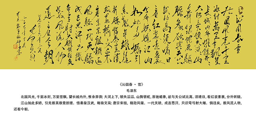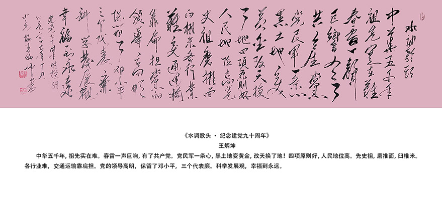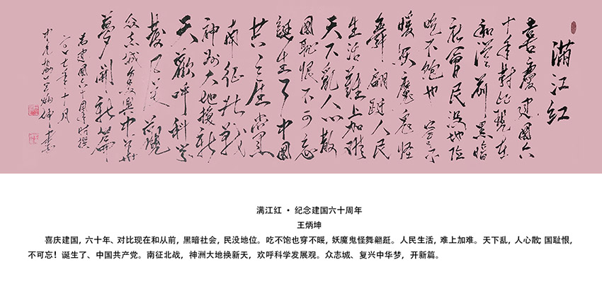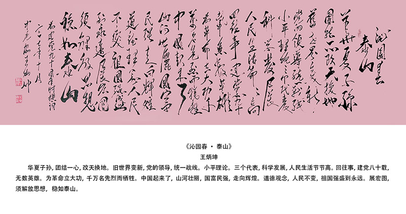王炳坤,1951 年10 月生于山东泰安,笔名王东明,中国著名毛体书法家,红色经典诗人。受清代爷爷(文秀才)的影响,自幼酷爱书法。其书法意学二王,悟得一代草圣张旭之法,独钟情毛公潇洒飘逸之情,自身文采奕奕,其书法独到耐味,观之有心旷神怡之妙、赏心悦目之感,从中体会到将书法创作视为一种传承载体所表达出的思想和灵魂。现任中国毛体书法家协会副会长,中国人民艺术家协会会员,世界文化研究院做客教授,山东泰安红色文化创作基地主任,常驻北京和香港。