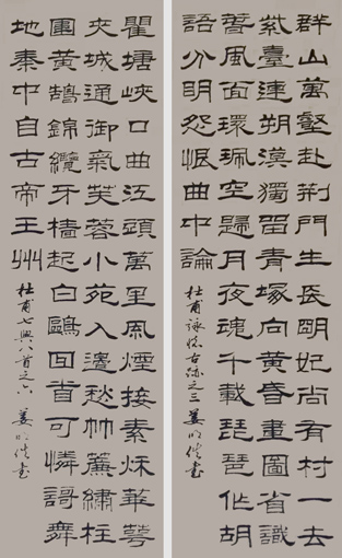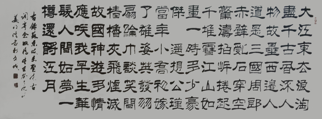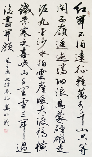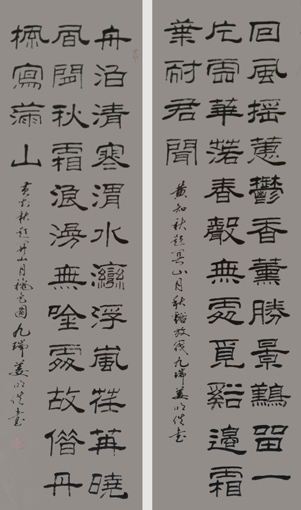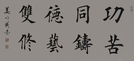 正书初学欧王,后学魏碑;行书学习王羲之、文征明;草书学王羲之、孙过庭、王铎诸家;隶书初学“海神庙”碑,后学张迁、史晨等碑;篆书学秦篆、石鼓。书风端庄秀逸,法度严谨。