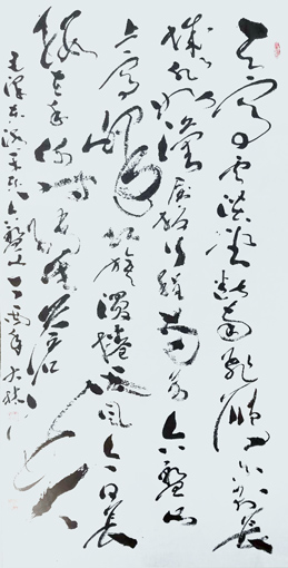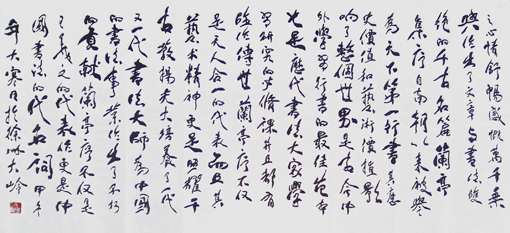 他的书作往往不拘中侧,予人以一种变化莫测而又法度谨严、清俊典雅而又活脱的美感。可谓“玩之不觉为倦,览之莫识其端”的旨趣。仅情动言行而已,笔势时而起伏流动,畅快淋漓;时而又缓进徐行,超逸出尘。其用笔潇洒自如,章法隐于其中,而胸臆涌流笔端,可称为妙篇巧构。创作内容有待加强,方能达到人书俱老,天心月满的境界。(苏士澍评)