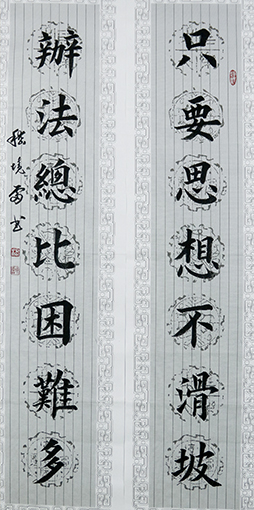 嵇境雷作品《只要思想不滑坡、办法总比困难多》规格:138cmx34cmx2