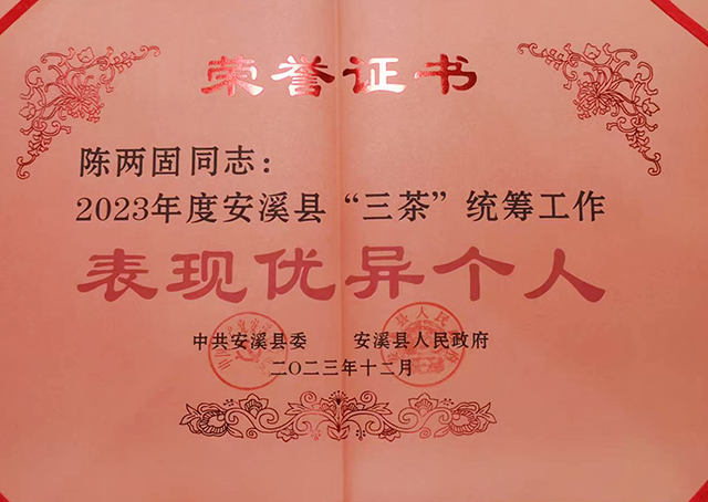 2024年12月荣获“安溪县制茶杰出人才”并颁发证书;