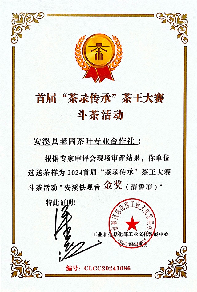 2024年9月参加 首届“茶录传承”茶王大赛斗茶活动荣获2024首届“茶录传承”茶王大赛斗茶活动“安溪铁观音金奖(清香型);