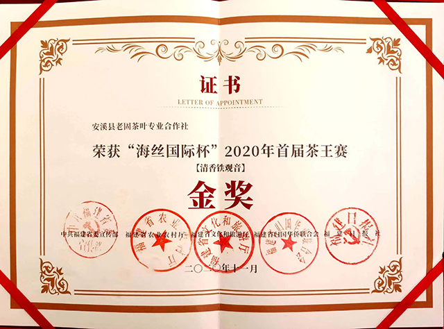 2020年11月 荣获“海丝国际杯”2020年首届茶王赛【清香铁观音】