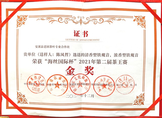 2021年12月 单位(送样人:陈凤哲)选送的清香型铁观音、浓香型铁观音荣获“海丝国际杯”2021年第二届茶王赛金奖:
