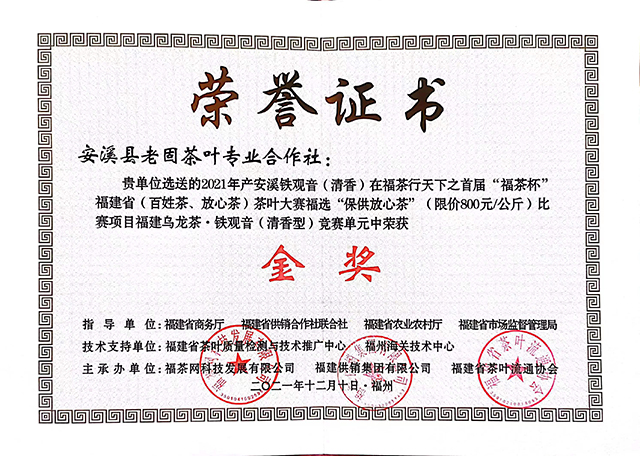 2021年12月单位选送的2021年产安溪铁观音(清香)在福茶行天下之首届“福茶杯”福建省(百姓茶、放心茶)茶叶大赛福选“保供放心茶”(限价800元/公斤)比赛项目福建乌龙茶·铁观音(清香型)竞赛单元中荣获:金奖
