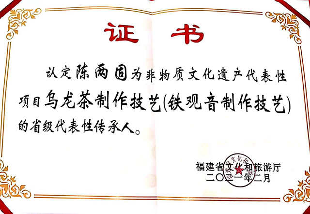 2021年2月认定为非物质文化遗产代表性项日鸟龙茶制作技艺(铁观音制作技艺)的省级代表性传承人,并颁发证书;