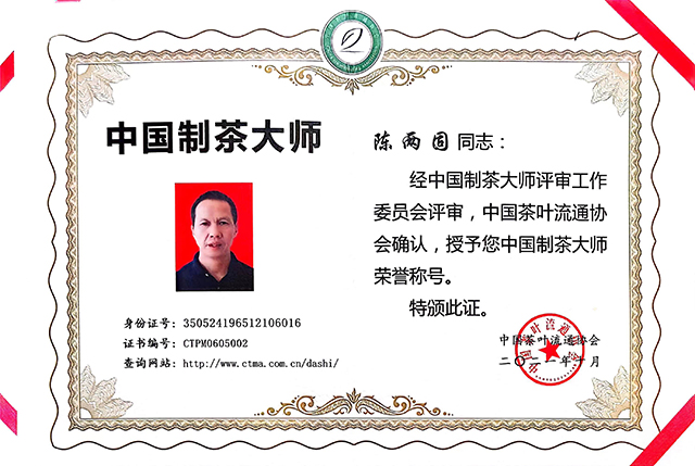2021年10月经中国制茶大师评审工作委员会评审,中国茶叶流通协会确认,荣获:中国制茶大师荣誉称号,并颁发证书;