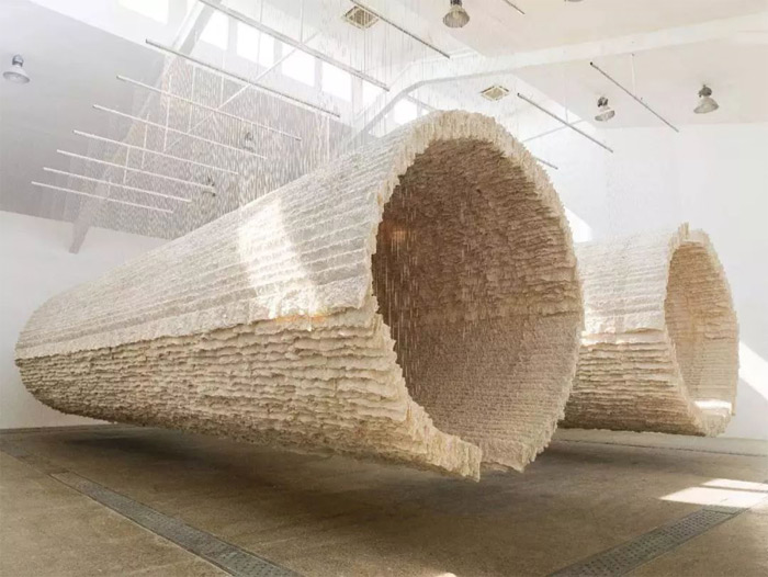 2010年之后,非对抗性和对抗性,在朱金石的内心和解了,不但可与整个世界和平共处,更有了几分禅意。2013年,大型装置《船》开始亮相于不同国家的各大艺博会。朱金石将其看作是生命旅程的象征,当观者走过装置内的通道时,他们的世界被层层叠叠的宣纸轻轻包裹、与外界短暂地隔开。2018年,在北京唐人艺术中心第一空间的宣纸装置作品《时间的船》精确到使用一万四千张宣纸,一千八百棵细竹,两千根七米绵线。作品纵贯气势恢宏,当光线从顶部天窗撒下,穿过密密的细线打在宣纸的褶皱上,苍桑与脆弱,坚固与柔软则同时映入视线。