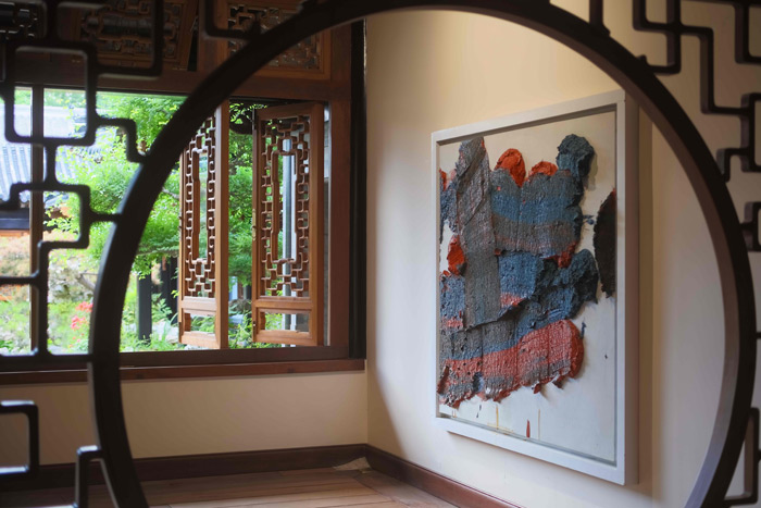 对于这样的一处别院,做展览并非易事,艺术作品极易沦为庭院点缀,必有非常之功的艺术作品方能不失风韵且相得益彰。此次“木·字”展,朱金石的作品俨然园中主角,两幅色彩丰富的“厚绘画”大作品仿佛花旦立于南北两厅,令别院有余音绕梁。不同于之前展览中艺术家多选取某一阶段作品展出,朱金石将自己40年的创作历程徐徐展开,每件作品都可圈可点,更可以点带面,纵可上述到每条创作主线,以不同时间段的观念变化为经;横可跨越国别语境,以国际当代艺术交往为纬。