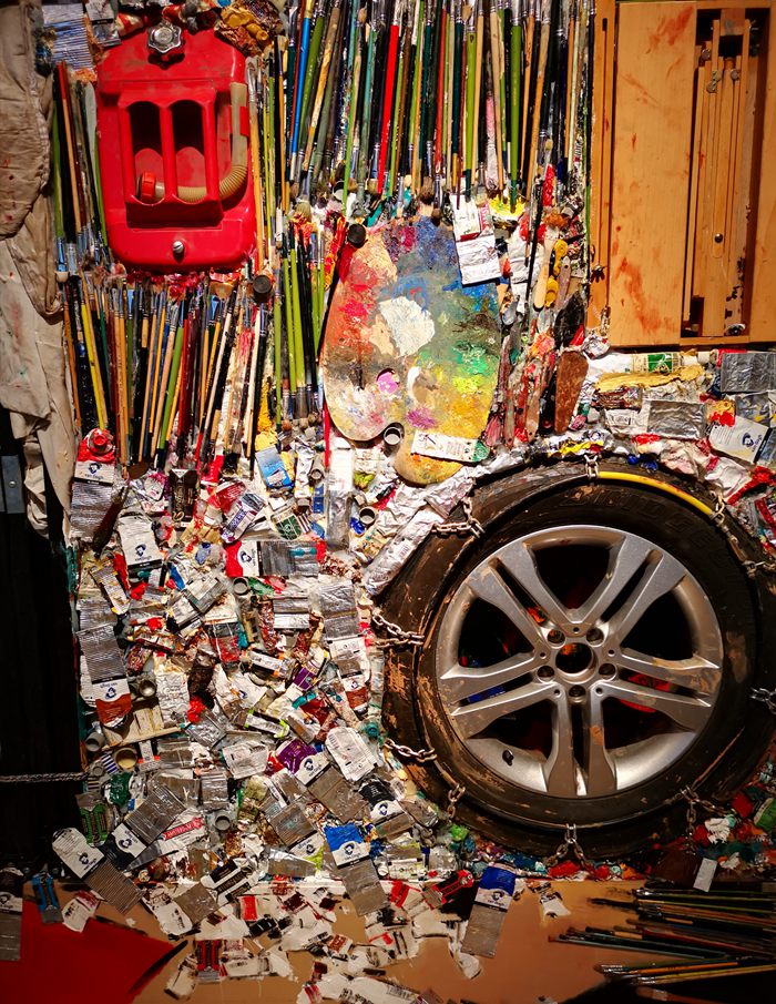 王克举将写生途中用过的画笔颜料等做成了装置作品