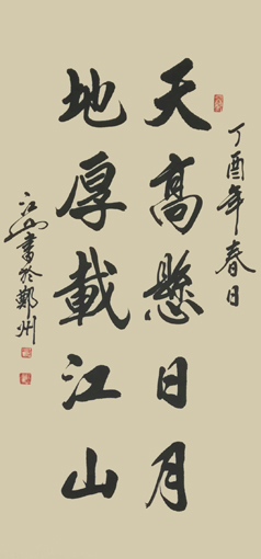 江山先生自幼酷爱文学书法,曾拜全国著名书法家王梦赓先生为师,扎实研练,默默耕耘。2005年以来尤其以书写冠名联见长,曾为包括国家领导人在内的社会各界人士书写冠名联七千余幅。江山书法秀美飘逸,雅俗共赏,多次参加全国书法大赛并屡获大奖。其中《沁园春·雪》,苏东坡词《念奴娇·赤壁怀古》等大幅行书作品,曾作为国礼赠送给韩国日本贵宾。部分作品已被欧阳询纪念馆,苏东坡纪念馆,李可染故居,中国盛世收藏拍卖公司,中国航空公司,中国集邮总公司等多家单位收藏。
