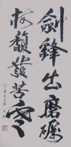 庄字,苍劲有力,作品大小字配搭合理,用量浓淡结合,恰到好处。有人问:“退休啦,不享清闲,为何还练字这么刻苦?”庄微笑答曰:“这祖宗留下来的文化 骨髓不可失,要传承发扬光大,这是一种责任,也是一种墨趣和感情,即能修身,也能养性,何乐而不为?”